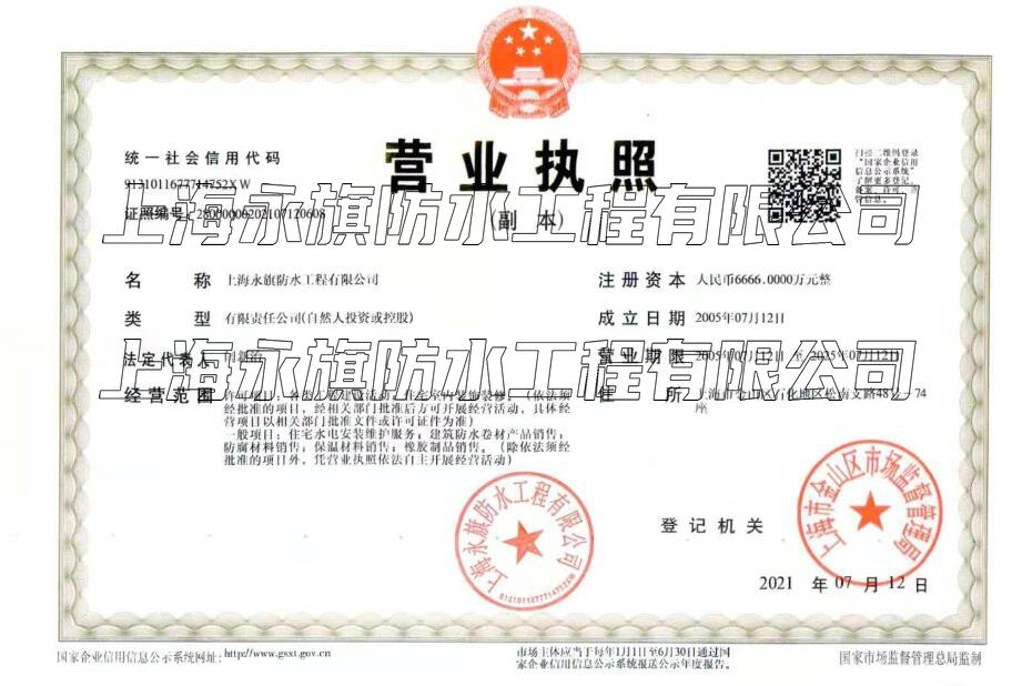 上海永旗防水工程有限公司位于中國大城市,魔都上海,上海市金山區(qū)石化地區(qū)松南支路48號(hào)-74座,于 2005年07月12日在金山區(qū)市場(chǎng)監(jiān)管局注冊(cè)成立,注冊(cè)資本為6666萬人民幣,在公司發(fā)展壯大的近二十年里, 我們始終為客戶提供好的產(chǎn)品和技術(shù)支持、健全的售后服務(wù)。
